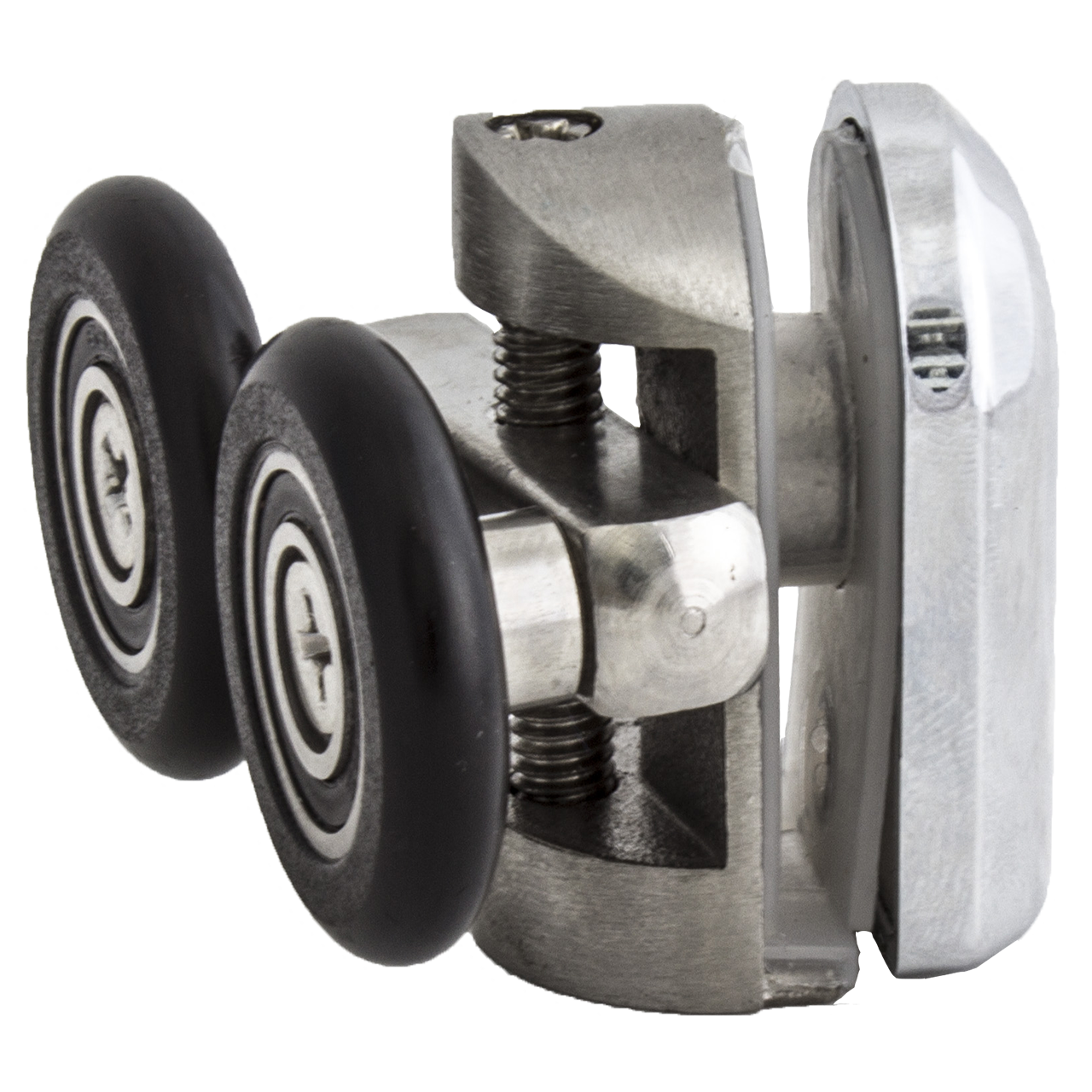 Корпус роликів виготовлений із металу та оснащений поворотним механізмом для плавного й безшумного ходу дверей. Задня частина закривається хромованим декоративним ковпачком, а всі металеві елементи мають захисне хромове покриття, що підвищує стійкість до вологи та корозії. Колесо фіксується до вагонетки за допомогою болта.
